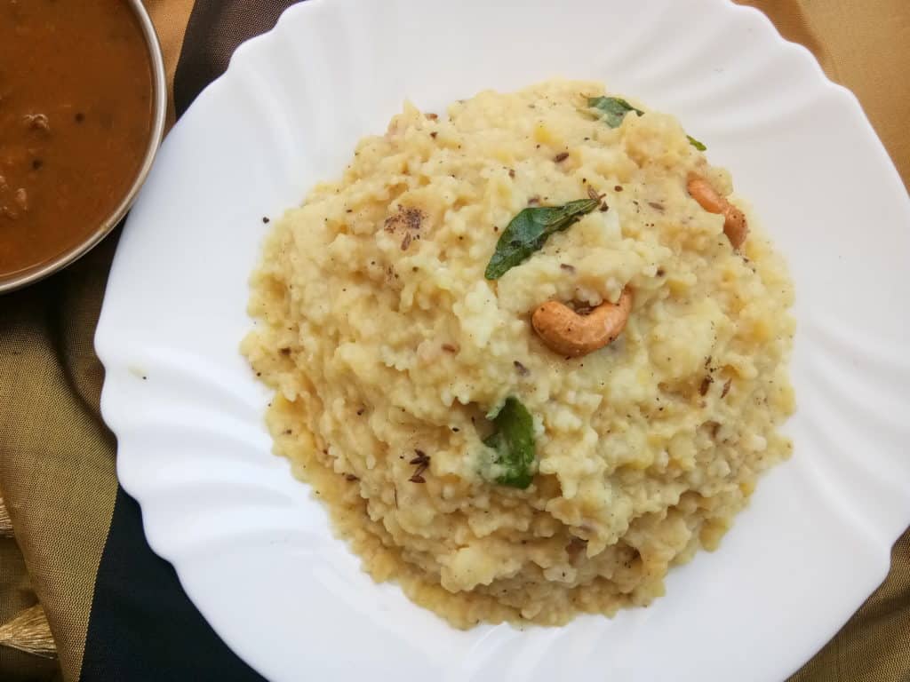 Set the pressure cooker to heat gently.Add the green gram dal and roast gently till it acquires a beautiful aroma. Add in the fox tail millet stir and add the water Close the pressure cooker and cook for 3-4 whistles Meanwhile in a small pan, add the ghee , cumin, crushed black pepper, curry leaves and cashew nuts and roast till the cashew nuts turn golden. Add in the asafoetida. Remove from heat. once the pressure is released, open and add the tempering and steam. Mix well, check salt. Serve with sambhar or chutney